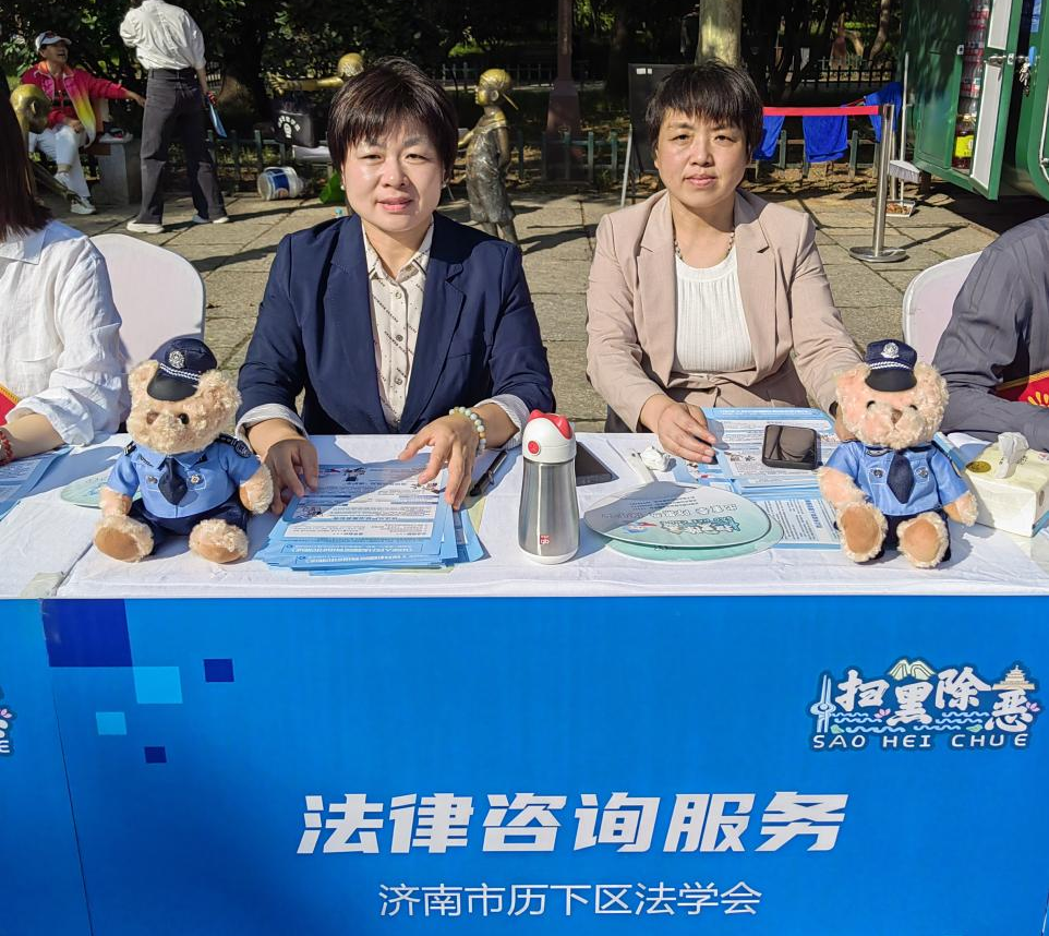 为深入贯彻落实中央及省委、市委政法工作会议精神,持续推进全市常态化扫黑除恶斗争走深走实,依据扫黑除恶斗争宣传工作统一部署,9月30日,由济南市扫黑除恶专项斗争领导小组办公室主办、历下区扫黑除恶专项斗争领导小组办公室承办、大明湖街道办事处协办的 “《中华人民共和国反有组织犯罪法》主题宣传活动” 在正谊广场正式举办。众成清泰济南所合伙人林静律师、林爱梨律师应济南市历下区法学会邀请,全程参与本次普法宣传及咨询工作。