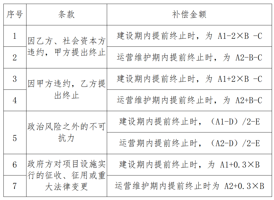 3.补偿计算:社会资本方有权依据合同约定或《民法典》第五百六十六条主张补偿(包括未收回的投资成本、合理利润等),政府方需对因公共利益解除导致的损失承担赔偿责任(《行政协议规定》第十六条)。一般而言,PPP项目合同中会根据各方责任不同设置相应赔偿标准,如在某PPP项目合同中,对于提前终止的赔偿约定如下: