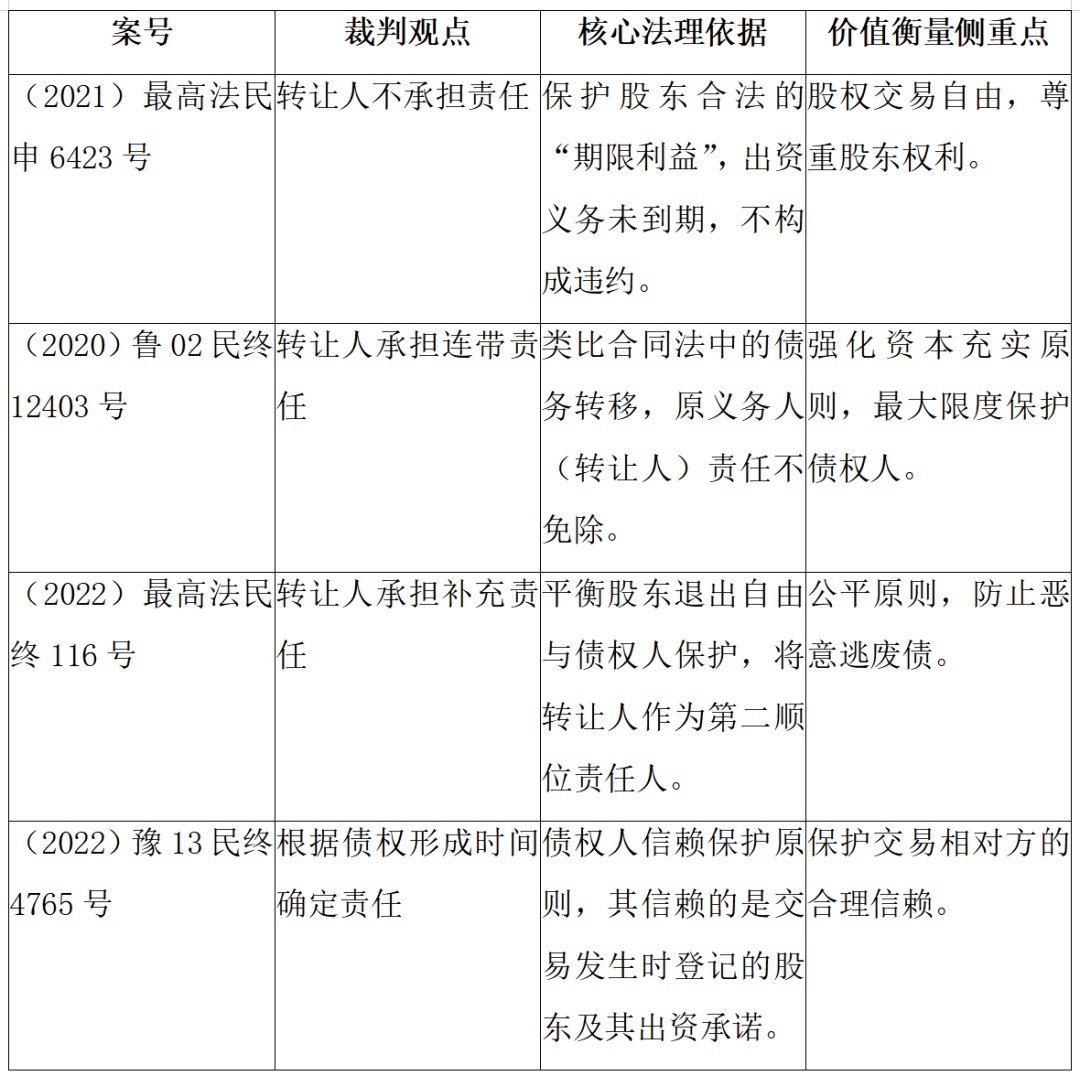 路径一:转让人免责说。部分法院认为,股东依法享有期限利益,在出资义务尚未到期时,其转让股权的行为并未违反任何法定义务。出资义务应随股权的转让而完整地转移给受让人。此观点优先保护了股东的交易自由和期限利益。其典型代表为最高人民法院在 (2021)最高法民申6423号 案中的裁判观点,该案认为认缴期限届满前转让股权的股东原则上无需担责。